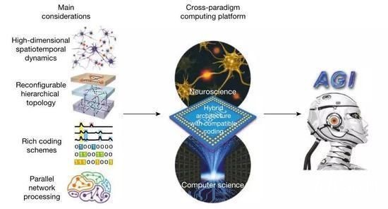 一般認為,實現通用人工智能有兩條路,分別為計算機科學導向和神經科學導向。天機芯就是神經科學導向,它采用了類似生物神經元的鏈接和運行方式,更接近人腦的工作方式。并且將這兩種方式統一在了一個運算單元中,融合了計算機科學和神經科學兩方的優勢,是一種推進人工通用智能發展的異構融合芯片架構。28nm的天機芯片由156個FCores組成,面積為3.8×3.8毫米,包含大約40000個神經元和1000萬個突觸,可以同時支持機器學習算法和類腦電路