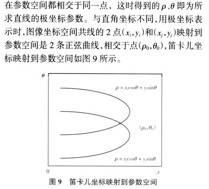 與直角坐標(biāo)類似,極坐標(biāo)中的霍夫變換也把圖像坐標(biāo)空間中的點(diǎn)變換到參數(shù)空間中。用極坐標(biāo)表示時(shí),圖像坐標(biāo)空間中共線的點(diǎn)映射到參數(shù)空間以后,在參數(shù)空間都相交于同一點(diǎn),這時(shí)得到的P、θ即為所求直線的極坐標(biāo)參數(shù)。