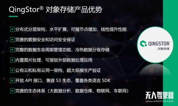 第三點,較高的性價比,目前QingStor對象存儲應用較為普遍,除了今天說的用在無人駕駛領域,在大數據分析平臺上也能作為大數據平臺的數據存儲,可以作為數據源和數據存儲目標,用一套平臺實現多種用途,降低整體的TCO。