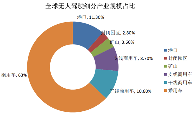 全球乘用車市場規(guī)模占比高達63%,也是通用Cruise、Google Waymo、PonyAI小馬智行等頂級科技企業(yè)的角力戰(zhàn)場。排在第二大的領(lǐng)域是港口無人駕駛,占比11.3%,產(chǎn)業(yè)規(guī)模2020年預(yù)計將達到279億美金。第三大、第四大領(lǐng)域則是干線商用車、支線商用車,由于需要專用無人駕駛道路的規(guī)劃和依賴于國家政策及安全法規(guī)等核心標(biāo)準(zhǔn)的出臺,其落地周期較之港口、礦山領(lǐng)域要長一些。此外第五大市場規(guī)模的領(lǐng)域就是礦山無人駕駛,占比約為3.6%。最后是封閉園區(qū)無人駕駛,占比約為2.8%。