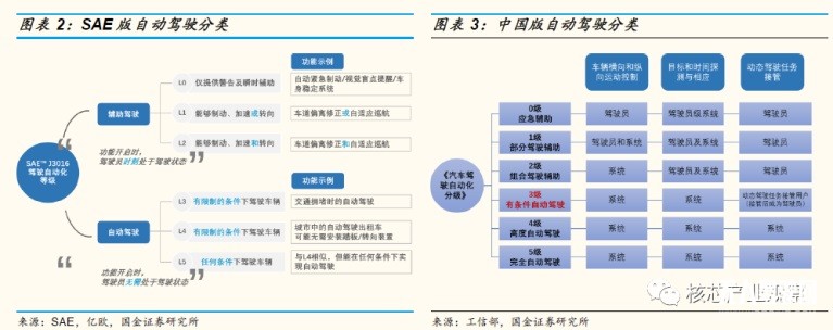 中美分類標準對每個具體的駕駛自動化功能分級結果基本一致。根據“開啟自動駕駛功能后,駕駛員是否應該處于駕駛狀態”為標準。SAE 發布的自動駕駛分級標準中,L3 級以上(包括 L3 級)的功能才能稱之為“自動駕駛功能”;中國《汽車駕駛自動化分級》中,以 L3 為界限,動態駕駛任務的接管者的主體發生改變。因此,L3 及以上級別才可被稱為“高等級自動駕駛”。即自動駕駛以 L3 為分界線,L3 以上(包括 L3)被稱為自動駕駛,L3 以下被稱為輔助駕駛。