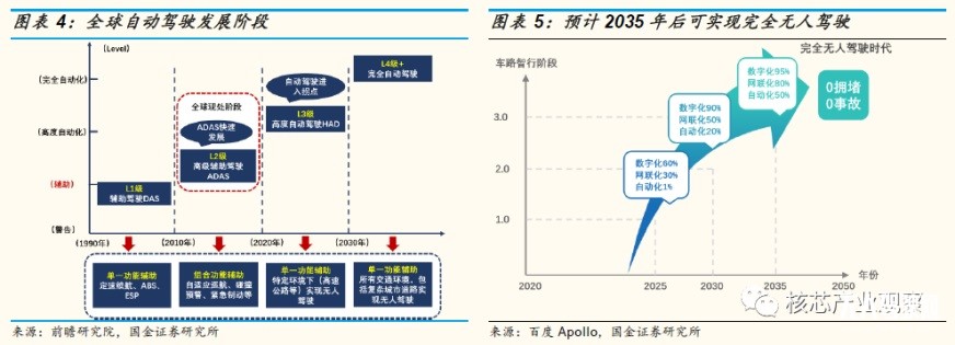 目前,全球自動駕駛處于 L2 向 L3 級別轉化的過程。L2 級的 ADAS(高級駕駛輔助系統)是實現高等級自動駕駛的基礎,目前全球正處于汽車自動化程度的第二階段,即 L2 級 ADAS 階段。在當前階段,依據駕駛環境信息,由一個或多個駕駛輔助系統在特定工況下執行轉向或加速/減速,同時駕駛員執行所有其余的各類動態駕駛任務。隨著技術的不斷進步,作為自動駕駛基礎的 ADAS 應用快速發展。