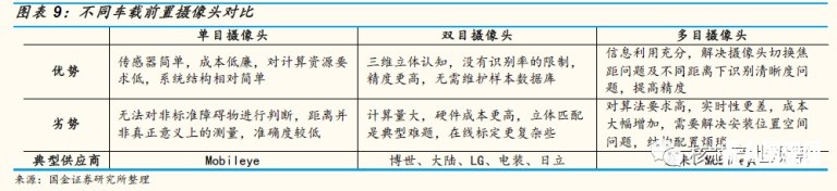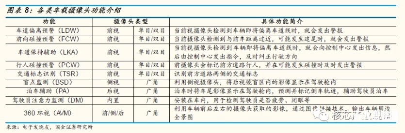 前視攝像頭最為重要,主要布置在車外用于感知車道、行人、路側等環境,按照不同功能解決方案可分為單目、雙目和多目等。攝像頭在車內主要應用于倒車影像(后視)和 360 度全景(環視)。高端汽車的各種輔助設備配備的攝像頭可以多達 8 個,用于輔助駕駛員泊車或觸發緊急剎車。
