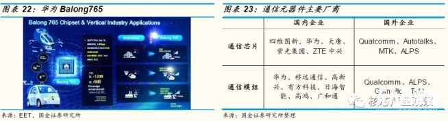 通信元器件:通信芯片、通信模組。通信芯片是處理各種數據的中樞,目 前市場主流通信芯片有華為雙模通信芯片 Balong 765;大唐的 PC5 Mode 4 LTE-V2X 自研芯片;高通的 9150 LTE-V2X 芯片組。通訊芯片及外圍器件組成了通信模組,如華為基于 Balong 765 芯片的 LTE-V2X 商用車規級通信模組 ME959;大唐基于自研芯片的 PC5 Mode 4 LTE-V2X 車規級通信模組 DMD31;移遠聯合高通發布的 LTE-V2X 通信模組 AG15。