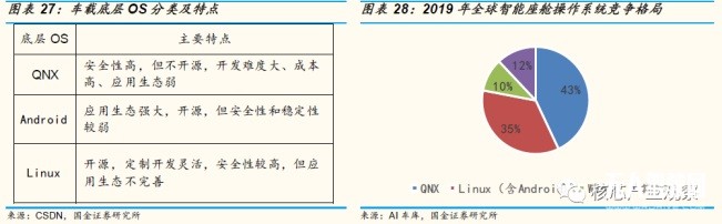 智能座艙操作系統:智能座艙操作系統主要為車載信息娛樂服務以及車內人機交互提供控制平臺,是汽車實現座艙智能化與多源信息融合的運行環境,支撐用戶應用平臺的定制開發。從用戶端為語音圖像識別、人機交互、地圖導航、信息安全、人-車-路- 云數據融合等應用提供支撐。隨著汽車場景逐漸轉變為智能移動終端,智能座艙操作系統需要通過支持更多個性化的應用服務及強大的生態,面向客戶進行差異化競爭。目前,全球智能座艙操作系統的標準還未統一,在傳統智能座艙操作系統中,QNX 占據了 40%以上的市場份額,但隨著智能座艙信息娛樂應用的逐漸豐富,擁有強大生態基礎的開源操作系統 Linux(含 Android)占據第二大市場空間。
