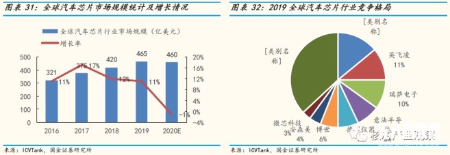 汽車芯片市場規模快速增長,壟斷格局逐步打破。據 ICVTank 數據顯示,2019 年全球汽車芯片市場規模達 465 億美元,同比增長 11%,受全球新冠疫情的影響,在汽車銷量下滑沖擊下,2020 年全球汽車芯片市場規模將有小幅下滑,預計規模為 460 億美元。2019 年,恩智浦占全球汽車芯片市場 14%,英飛凌次之,占比 11%,目前全球汽車芯片的市場集中度較高,行業 CR4 為 43%,行業 CR8 達 63%。隨著汽車行業加速進入智能化時代,這一格局將逐步打破,包括以高通、英偉達為代表的傳統汽車半導體廠商、以谷歌、亞馬遜、蘋果等為代表的互聯網科技公司、以奧迪、寶馬、特斯拉為代表的整車企業大舉進軍自動駕駛芯片領域,行業未來將會形成多頭競爭的格局。