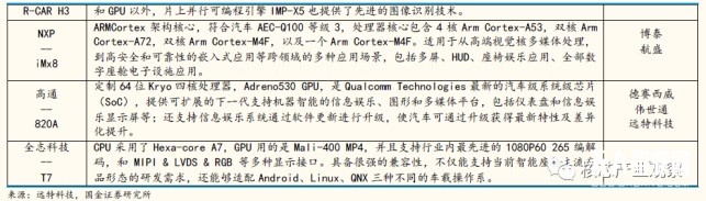 VI 芯片為車載信息娛樂系統芯片,隨著自動駕駛的技術的發展,IVI 逐步升級為智能駕倉,其包含的智能座艙電子的連接越來越多,包括V2X、WIF I、藍牙、4G、T-BOX,高精度地圖等。目前,各大 Tier1 正在推出或在研的智能座艙平臺方案,包括 NXP、瑞薩等傳統汽車芯片供應商外,以及高通、英特爾等在內的老牌芯片企業和國產芯片商全志科技,都在紛紛推出自家的智能座艙芯片產品。