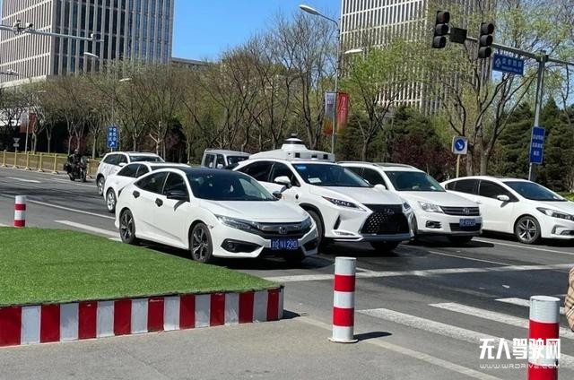 自動(dòng)駕駛測試車和其他機(jī)動(dòng)車輛一起等待紅燈
