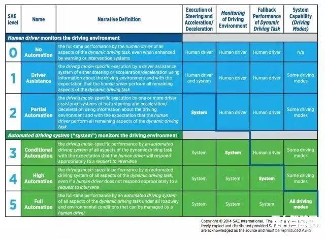目前國內外產業界采用較多的為美國汽車工程師協會(SAE)和美國高速公路安全管理局(NHTSA)推出的分類標準。