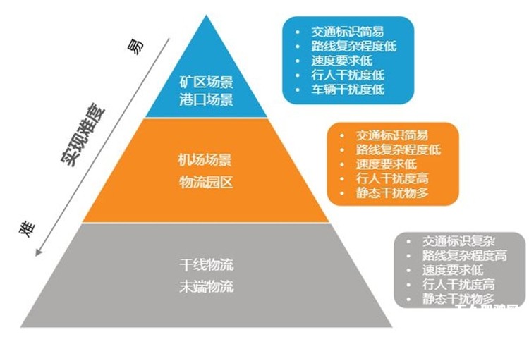 當前自動駕駛在載貨商用車領域有六大主流應用場景,包括:礦區場景、港口場景、物流園區、機場場景、干線物流、末端物流。