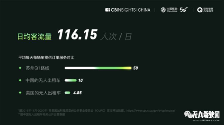 報告從每天每輛車提供的訂單服務數量角度比較了無人公交和無人出租的載客情況,在蘇州常態化運營的無人公交 Q1 路平均每天每輛車提供 58 次訂單服務。