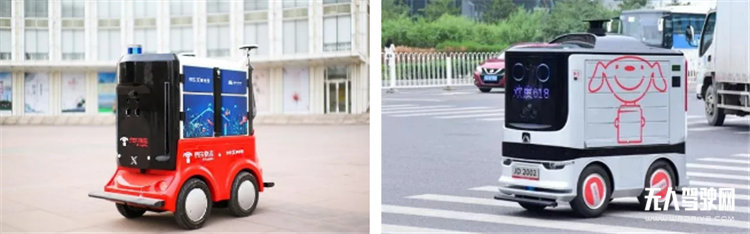 京東:2017年"6-18",京東首批試點運營的無人配送車在中國人民大學進行快遞投遞。2018年"6-18",在京東的北京上地配送站,20余臺配送機器人整齊列陣。隨著調度平臺命令發出,首批載有”6-18”貨物訂單的配送機器人依次出發,自動駛向訂單配送的目的地。