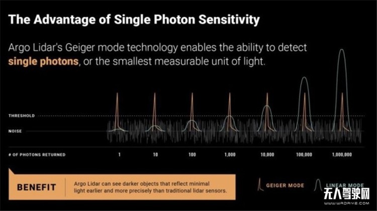 與其他所有汽車激光雷達相比,Argo的關鍵區別是蓋革模式雪崩光電二極管(GmAPD)陣列。這是探測從物體反射回來的光子的組件。大多數激光雷達使用光電傳感器產生模擬輸出信號,其值與探測到的光子數成正比。越近的物體,反射率越高,探測器將產生更多的返回波和更強的電壓。這種方法的問題是,較弱的返回波產生較低的電壓,需要一個最小的閾值來區分信號和噪聲。GmAPD陣列上的單個像素可檢測出帶有尖峰輸出的單個光子,光子的尖峰輸出與噪聲明顯不同。其結果是每個像素都有一個數字開/關輸出。統計抽樣技術被用來聚集整個陣列的反射,這提供了準確檢測返回和在更長的距離抗擾的能力。