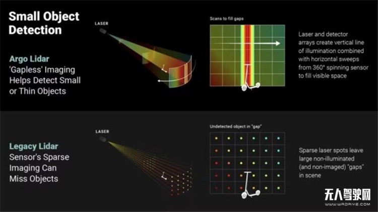 Argo沒有討論激光發射器的實際數量,但有一列激光通過一個透鏡,每個脈沖會產生一個垂直的光片。因此,該切片中的所有內容都會同時被檢測到,具有更高的分辨率,本質上就像捕捉一張照片圖像一樣。并不像大多數固態激光雷達那樣有光束導向系統,而是只有垂直切片和旋轉整個傳感器的機制。