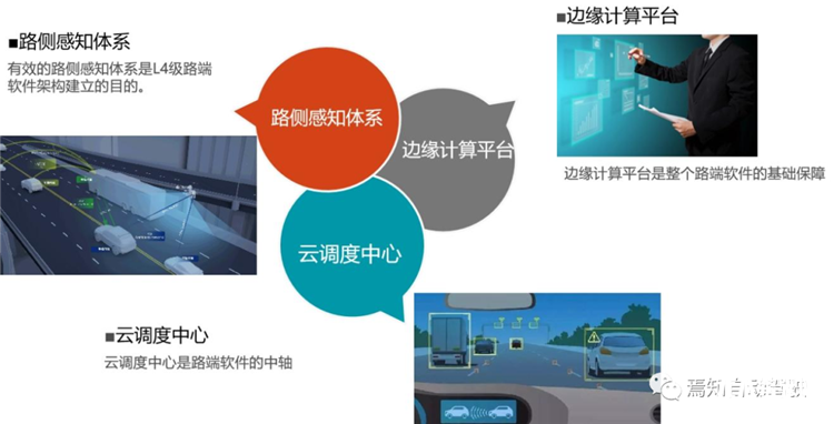 L4級(jí)自動(dòng)駕駛系統(tǒng)的開(kāi)發(fā)的軟件架構(gòu)中不僅包含常規(guī)的車端軟件,也包含后續(xù)新一代的路端軟件。路端軟件實(shí)際是指包含路端感知體系、云端信息調(diào)度以及邊緣計(jì)算平臺(tái)三個(gè)大模塊。
