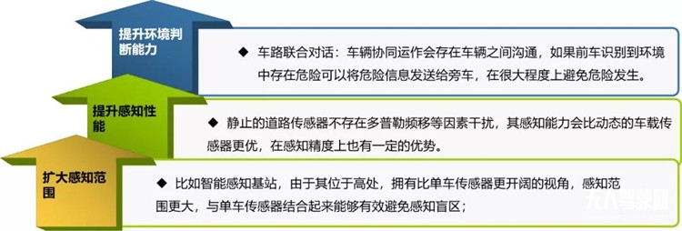 自動(dòng)駕駛汽車涉及人和車、車和車、車和路之間的默契配合。考慮道路智能化,把智能設(shè)備安置在道路上,通過(guò)通信網(wǎng)絡(luò),感知到的數(shù)據(jù)可以共享給周邊更多車輛,這樣將使自動(dòng)駕駛更好的運(yùn)作在定義的設(shè)計(jì)環(huán)境中,減少碰撞等危險(xiǎn)因素。