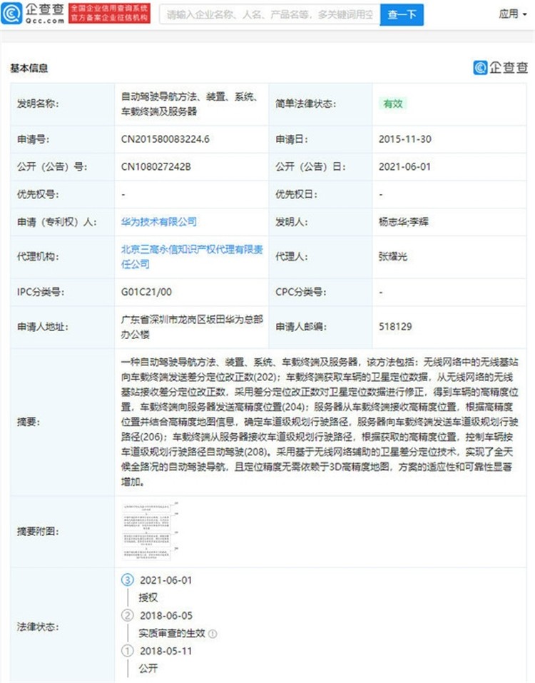 企查查內容顯示,早在2015年11月30日,華為就已申請“自動駕駛導航方法、裝置、系統、車載終端及服務器”專利,該專利于2018年5月11日公開,于2021年6月1日獲得授權。