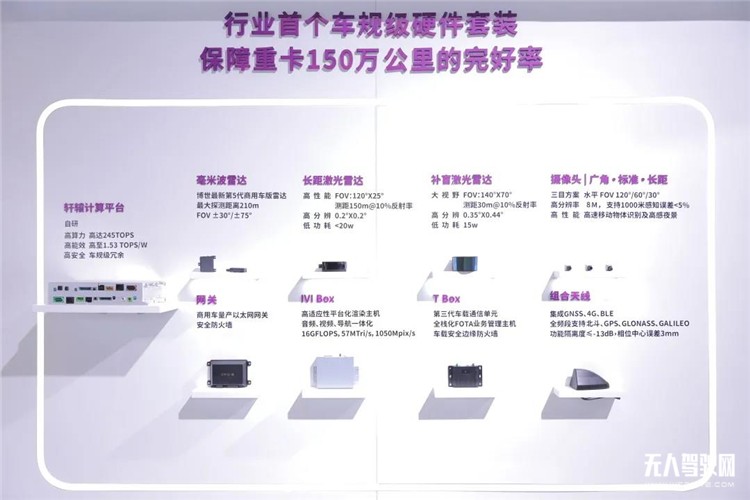 在這次大會上嬴徹也首次展示了全套車規(guī)級硬件套裝,包括長距和補盲激光雷達(dá)、毫米波雷達(dá)、攝像頭、GPS/IMU、計算平臺、網(wǎng)關(guān)、T-Box、IVI-Box等,所有零部件均經(jīng)過包括工程、開發(fā)、生產(chǎn)三階段的嚴(yán)格認(rèn)證,和電氣、機械、環(huán)境和電磁的試驗驗證,滿足重卡150萬公里生命周期的可靠性耐久性。