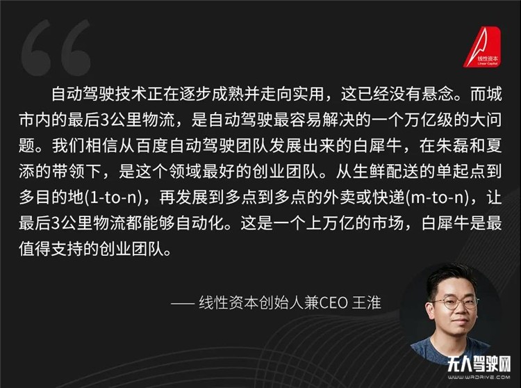 對于該輪融資,線性資本創始人兼 CEO 王淮表示:“自動駕駛技術正在逐步成熟并走向實用,這已經沒有懸念。而城市內的最后3公里物流,是自動駕駛最容易解決的一個萬億級的大問題。我們相信從百度自動駕駛團隊發展出來的白犀牛,在朱磊和夏添的帶領下,是這個領域最好的創業團隊。從生鮮配送的單起點到多目的地(1-to-n),再發展到多點到多點的外賣或快遞(m-to-n),讓最后3公里物流都能夠自動化。這是一個上萬億的市場,白犀牛是最值得支持的創業團隊。”
