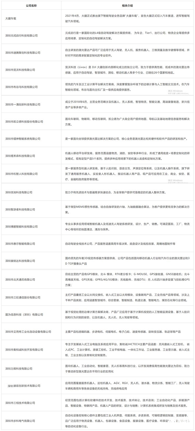 表:深圳自動(dòng)駕駛相關(guān)企業(yè)(本表粗略統(tǒng)計(jì),如有未完善之處,請(qǐng)指正!)