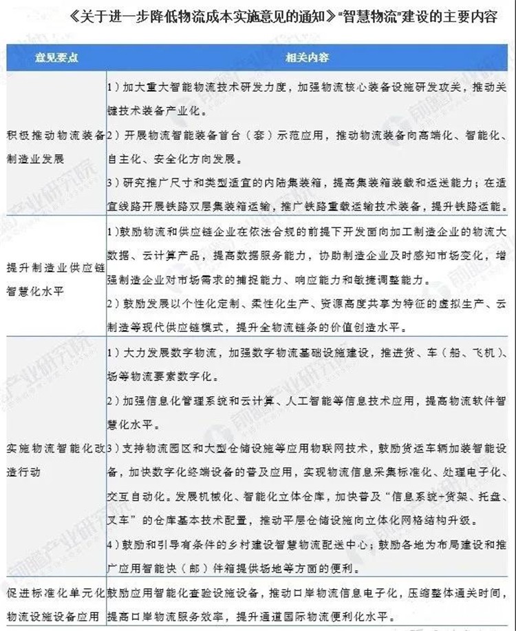 總體看來,政策主要從物流裝備、物流基礎設施設備、供應鏈建設水平、服務模式和信息技術應用等多方面引導和促進我國智慧物流行業發展。