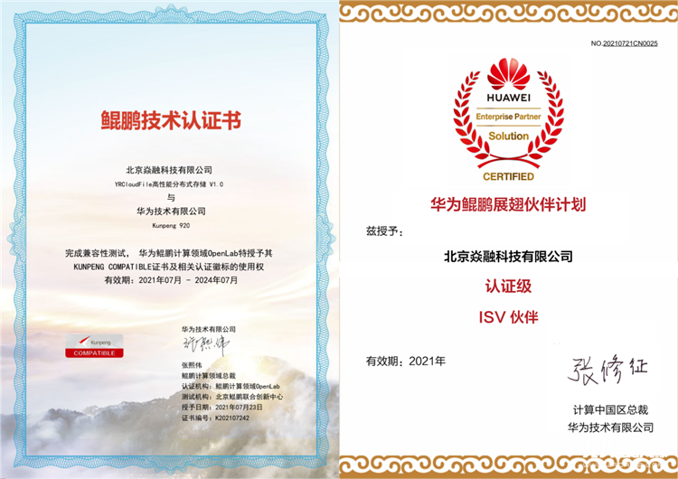 近日,經過多維度的嚴格驗證,北京焱融科技YRCloudFile 高性能分布式文件存儲產品與華為Kunpeng920 完成兼容性測試,正式獲得華為鯤鵬計算領域OpenLab特予的KUNPENG COMPATIBLE證書。