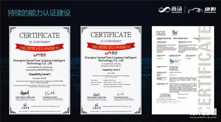 在汽車軟件開發層面,商湯先后于2019年12月及2020年7月通過了ASPICE(汽車軟件過程改進及能力評定) CL1級和CL2級認證,成為亞洲最早拿到ASPICE認證的AI平臺公司。
