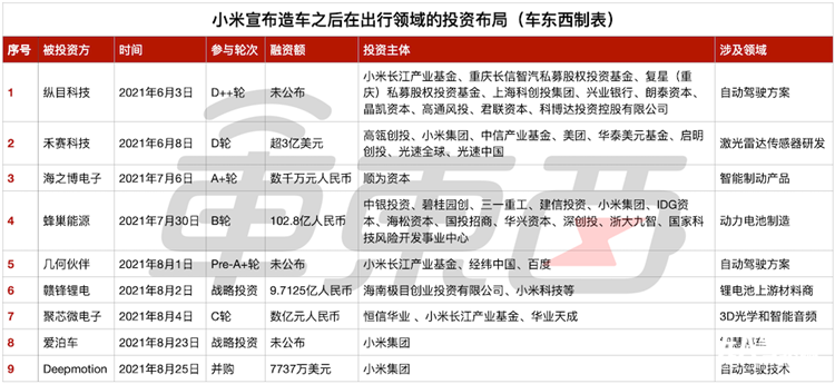不過(guò)跟其他的資本機(jī)構(gòu)不同,小米在投資人的身份之外,也選擇了下場(chǎng)造車,從觀眾變成了參賽選手。所以在宣布造車之后,小米的投資更加集中。