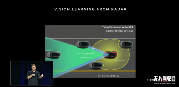 值得一提的是,在他講解時的背景幻燈片右下角上,清晰地注明了帶有毫米波雷達的自動駕駛算法是“Semi-Automonous Self Driving”,翻譯過來是,半自動駕駛,明顯彼時的特斯拉Autopilot只是個半成品。