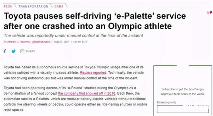 關(guān)于事故發(fā)生的原因,東京奧組委奧運(yùn)舉辦統(tǒng)管中村英正發(fā)表了道歉聲明,并表示警方正在進(jìn)一步調(diào)查。而根據(jù)外網(wǎng)的報(bào)道,e-Palette在事故發(fā)生不久之前,曾因傳感器檢測到路邊的警衛(wèi)員而停車。
