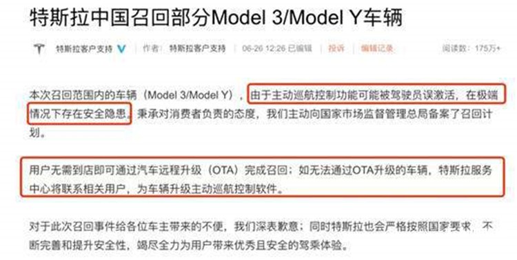 以“特斯拉加速門”為例,2021年6月26日,國家市場監(jiān)督管理總局發(fā)布公告稱,特斯拉將召回部分進(jìn)口和國產(chǎn)Model3和ModelY電動(dòng)汽車,總計(jì)約28.6萬輛。而特斯拉召回車輛的原因在于其主動(dòng)巡航控制系統(tǒng)問題,易造成駕駛員誤激活主動(dòng)巡航功能,以至于在極端情況下存在安全隱患。