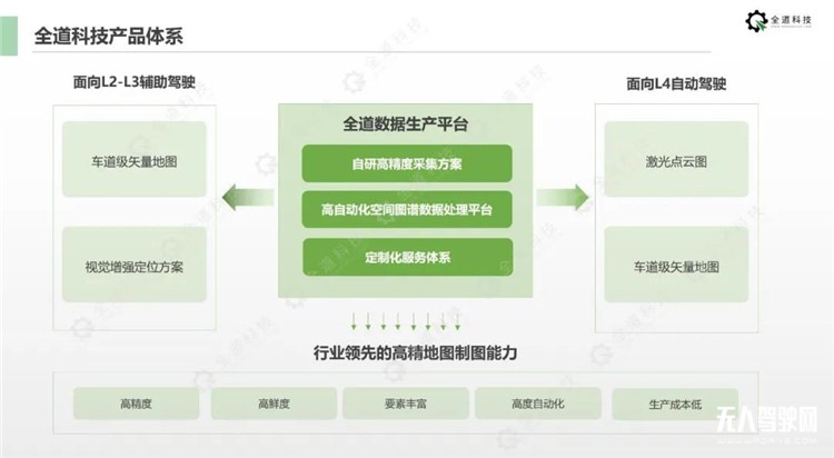 在向L2-L3級別提供車道級矢量地圖與視覺增強定位方案的同時,全道科技同時具備大規模量產級L4激光點云產線,并可提供L4高精地圖數據應用全棧解決方案。