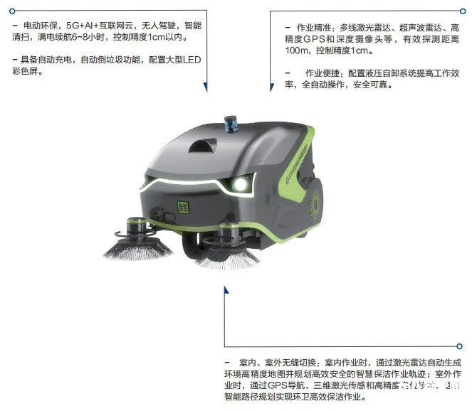 這款產品采用國內先進的無人駕駛控制技術,“互聯網云+機器人”智慧遠程集群物聯互聯模式可大幅度提升環境環衛行業的智能化水平和作業效率,杜絕環衛人工作業的安全隱患及安全事故發生,大幅節省環境環衛人力成本,經濟社會效益顯著、應用前景廣闊。主要適用于廣場、公園、產業園區、學校、機場、高鐵等眾多場所區域的清掃保潔作業。