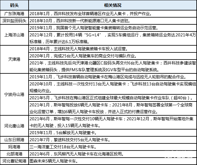 國內(nèi)部分自動化碼頭無人駕駛集卡投用情況(新戰(zhàn)略無人駕駛產(chǎn)業(yè)研究所不完全統(tǒng)計)