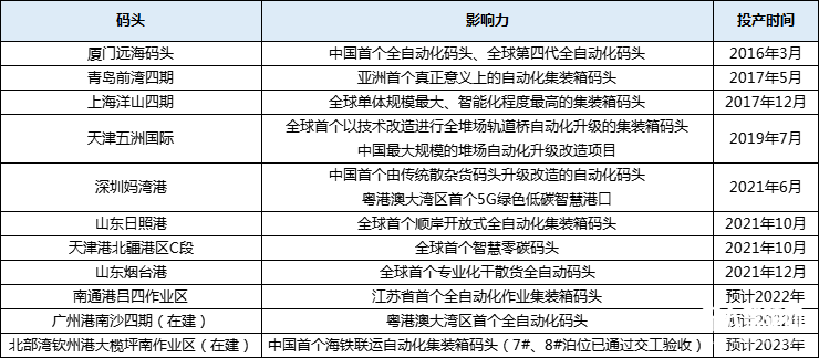 國內(nèi)部分自動化碼頭建設(shè)情況(新戰(zhàn)略無人駕駛產(chǎn)業(yè)研究所不完全統(tǒng)計)