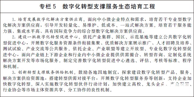 (一)加快企業數字化轉型升級。引導企業強化數字化思維,提升員工數字技能和數據管理能力,全面系統推動企業研發設計、生產加工、經營管理、銷售服務等業務數字化轉型。支持有條件的大型企業打造一體化數字平臺,全面整合企業內部信息系統,強化全流程數據貫通,加快全價值鏈業務協同,形成數據驅動的智能決策能力,提升企業整體運行效率和產業鏈上下游協同效率。實施中小企業數字化賦能專項行動,支持中小企業從數字化轉型需求迫切的環節入手,加快推進線上營銷、遠程協作、數字化辦公、智能生產線等應用,由點及面向全業務全流程數字化轉型延伸拓展。鼓勵和支持互聯網平臺、行業龍頭企業等立足自身優勢,開放數字化資源和能力,幫助傳統企業和中小企業實現數字化轉型。推行普惠性“上云用數賦智”服務,推動企業上云、上平臺,降低技術和資金壁壘,加快企業數字化轉型。