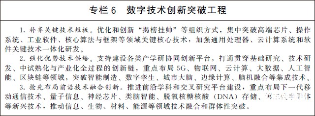 (一)增強關鍵技術創新能力。瞄準傳感器、量子信息、網絡通信、集成電路、關鍵軟件、大數據、人工智能、區塊鏈、新材料等戰略性前瞻性領域,發揮我國社會主義制度優勢、新型舉國體制優勢、超大規模市場優勢,提高數字技術基礎研發能力。以數字技術與各領域融合應用為導向,推動行業企業、平臺企業和數字技術服務企業跨界創新,優化創新成果快速轉化機制,加快創新技術的工程化、產業化。鼓勵發展新型研發機構、企業創新聯合體等新型創新主體,打造多元化參與、網絡化協同、市場化運作的創新生態體系。支持具有自主核心技術的開源社區、開源平臺、開源項目發展,推動創新資源共建共享,促進創新模式開放化演進。