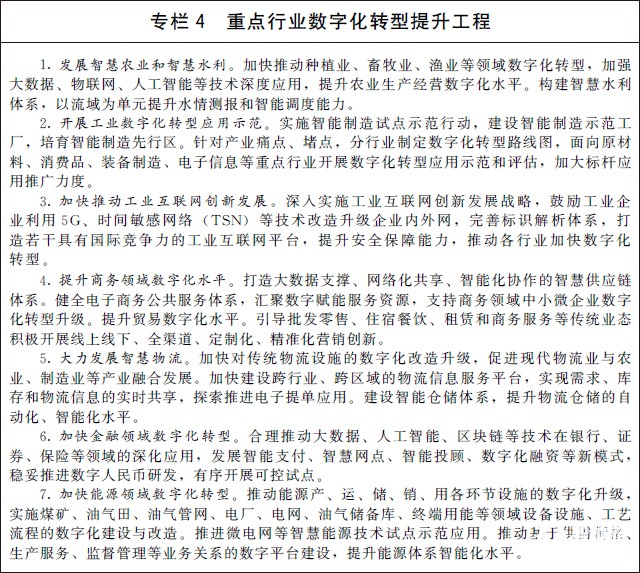 (二)全面深化重點產業數字化轉型。立足不同產業特點和差異化需求,推動傳統產業全方位、全鏈條數字化轉型,提高全要素生產率。大力提升農業數字化水平,推進“三農”綜合信息服務,創新發展智慧農業,提升農業生產、加工、銷售、物流等各環節數字化水平。縱深推進工業數字化轉型,加快推動研發設計、生產制造、經營管理、市場服務等全生命周期數字化轉型,加快培育一批“專精特新”中小企業和制造業單項冠軍企業。深入實施智能制造工程,大力推動裝備數字化,開展智能制造試點示范專項行動,完善國家智能制造標準體系。培育推廣個性化定制、網絡化協同等新模式。大力發展數字商務,全面加快商貿、物流、金融等服務業數字化轉型,優化管理體系和服務模式,提高服務業的品質與效益。促進數字技術在全過程工程咨詢領域的深度應用,引領咨詢服務和工程建設模式轉型升級。加快推動智慧能源建設應用,促進能源生產、運輸、消費等各環節智能化升級,推動能源行業低碳轉型。加快推進國土空間基礎信息平臺建設應用。推動產業互聯網融通應用,培育供應鏈金融、服務型制造等融通發展模式,以數字技術促進產業融合發展。