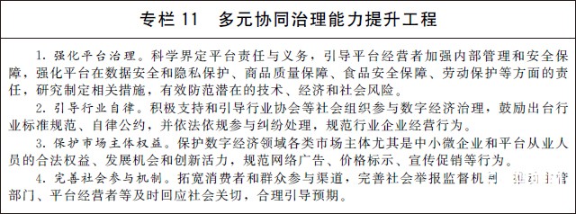 (三)完善多元共治新格局。建立完善政府、平臺、企業、行業組織和社會公眾多元參與、有效協同的數字經濟治理新格局,形成治理合力,鼓勵良性競爭,維護公平有效市場。加快健全市場準入制度、公平競爭審查機制,完善數字經濟公平競爭監管制度,預防和制止濫用行政權力排除限制競爭。進一步明確平臺企業主體責任和義務,推進行業服務標準建設和行業自律,保護平臺從業人員和消費者合法權益。開展社會監督、媒體監督、公眾監督,培育多元治理、協調發展新生態。鼓勵建立爭議在線解決機制和渠道,制定并公示爭議解決規則。引導社會各界積極參與推動數字經濟治理,加強和改進反壟斷執法,暢通多元主體訴求表達、權益保障渠道,及時化解矛盾糾紛,維護公眾利益和社會穩定。