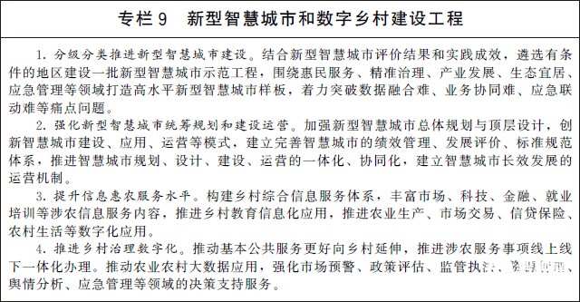 (三)推動數字城鄉融合發展。統籌推動新型智慧城市和數字鄉村建設,協同優化城鄉公共服務。深化新型智慧城市建設,推動城市數據整合共享和業務協同,提升城市綜合管理服務能力,完善城市信息模型平臺和運行管理服務平臺,因地制宜構建數字孿生城市。加快城市智能設施向鄉村延伸覆蓋,完善農村地區信息化服務供給,推進城鄉要素雙向自由流動,合理配置公共資源,形成以城帶鄉、共建共享的數字城鄉融合發展格局。構建城鄉常住人口動態統計發布機制,利用數字化手段助力提升城鄉基本公共服務水平。