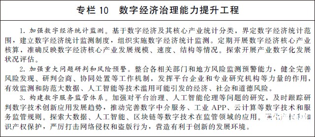 (二)增強政府數字化治理能力。加大政務信息化建設統籌力度,強化政府數字化治理和服務能力建設,有效發揮對規范市場、鼓勵創新、保護消費者權益的支撐作用。建立完善基于大數據、人工智能、區塊鏈等新技術的統計監測和決策分析體系,提升數字經濟治理的精準性、協調性和有效性。推進完善風險應急響應處置流程和機制,強化重大問題研判和風險預警,提升系統性風險防范水平。探索建立適應平臺經濟特點的監管機制,推動線上線下監管有效銜接,強化對平臺經營者及其行為的監管。