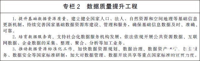 (一)強化高質量數據要素供給。支持市場主體依法合規開展數據采集,聚焦數據的標注、清洗、脫敏、脫密、聚合、分析等環節,提升數據資源處理能力,培育壯大數據服務產業。推動數據資源標準體系建設,提升數據管理水平和數據質量,探索面向業務應用的共享、交換、協作和開放。加快推動各領域通信協議兼容統一,打破技術和協議壁壘,努力實現互通互操作,形成完整貫通的數據鏈。推動數據分類分級管理,強化數據安全風險評估、監測預警和應急處置。深化政務數據跨層級、跨地域、跨部門有序共享。建立健全國家公共數據資源體系,統籌公共數據資源開發利用,推動基礎公共數據安全有序開放,構建統一的國家公共數據開放平臺和開發利用端口,提升公共數據開放水平,釋放數據紅利。