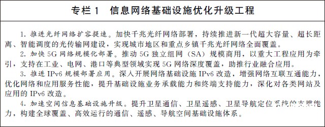 (一)加快建設信息網絡基礎設施。建設高速泛在、天地一體、云網融合、智能敏捷、綠色低碳、安全可控的智能化綜合性數字信息基礎設施。有序推進骨干網擴容,協同推進千兆光纖網絡和5G網絡基礎設施建設,推動5G商用部署和規模應用,前瞻布局第六代移動通信(6G)網絡技術儲備,加大6G技術研發支持力度,積極參與推動6G國際標準化工作。積極穩妥推進空間信息基礎設施演進升級,加快布局衛星通信網絡等,推動衛星互聯網建設。提高物聯網在工業制造、農業生產、公共服務、應急管理等領域的覆蓋水平,增強固移融合、寬窄結合的物聯接入能力。