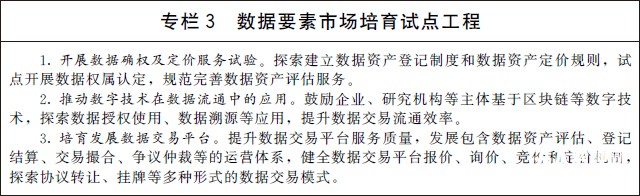 (二)加快數據要素市場化流通。加快構建數據要素市場規則,培育市場主體、完善治理體系,促進數據要素市場流通。鼓勵市場主體探索數據資產定價機制,推動形成數據資產目錄,逐步完善數據定價體系。規范數據交易管理,培育規范的數據交易平臺和市場主體,建立健全數據資產評估、登記結算、交易撮合、爭議仲裁等市場運營體系,提升數據交易效率。嚴厲打擊數據黑市交易,營造安全有序的市場環境。