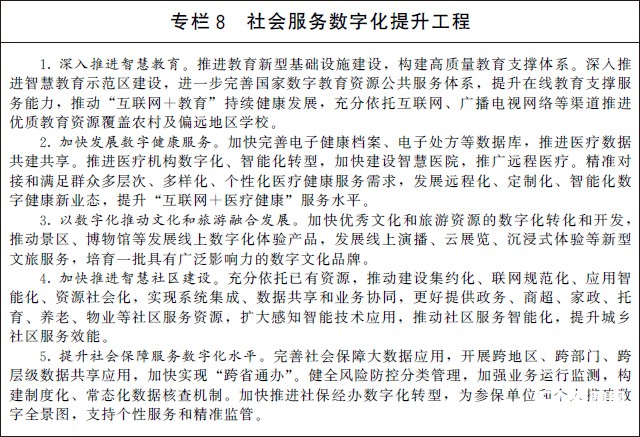 (二)提升社會服務數字化普惠水平。加快推動文化教育、醫療健康、會展旅游、體育健身等領域公共服務資源數字化供給和網絡化服務,促進優質資源共享復用。充分運用新型數字技術,強化就業、養老、兒童福利、托育、家政等民生領域供需對接,進一步優化資源配置。發展智慧廣電網絡,加快推進全國有線電視網絡整合和升級改造。深入開展電信普遍服務試點,提升農村及偏遠地區網絡覆蓋水平。加強面向革命老區、民族地區、邊疆地區、脫貧地區的遠程服務,拓展教育、醫療、社保、對口幫扶等服務內容,助力基本公共服務均等化。加強信息無障礙建設,提升面向特殊群體的數字化社會服務能力。促進社會服務和數字平臺深度融合,探索多領域跨界合作,推動醫養結合、文教結合、體醫結合、文旅融合。