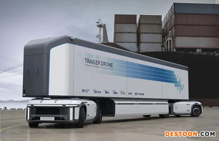 2021進博會上,現(xiàn)代汽車帶來了Trailer Drone概念卡車。作為一種可實現(xiàn)完全自動駕駛的集裝箱運輸系統(tǒng),其搭載氫燃料電池系統(tǒng)作為動力源,同時搭載兩臺智能無人運輸平臺e-Bogie。