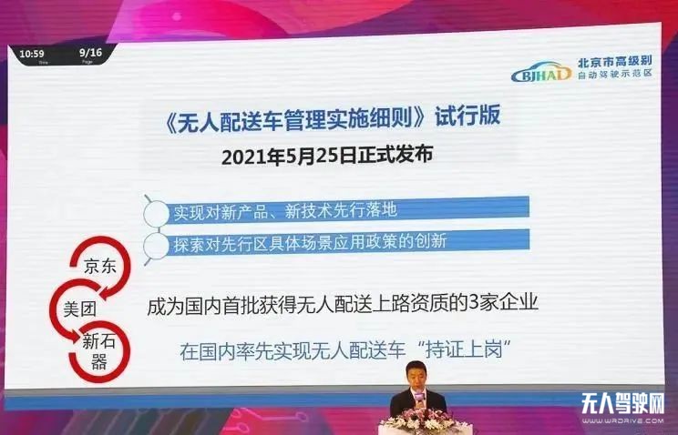 2021年5月,由北京市經濟技術開發區正式發布,是全國首個無人配送車運營管理實施細則,突破了無人配送車受現行法律法規限制無法合規上路,拓展了無人配送車測試驗證空間,將推動無人配送車技術創新,從場景應用加快走向商業化。