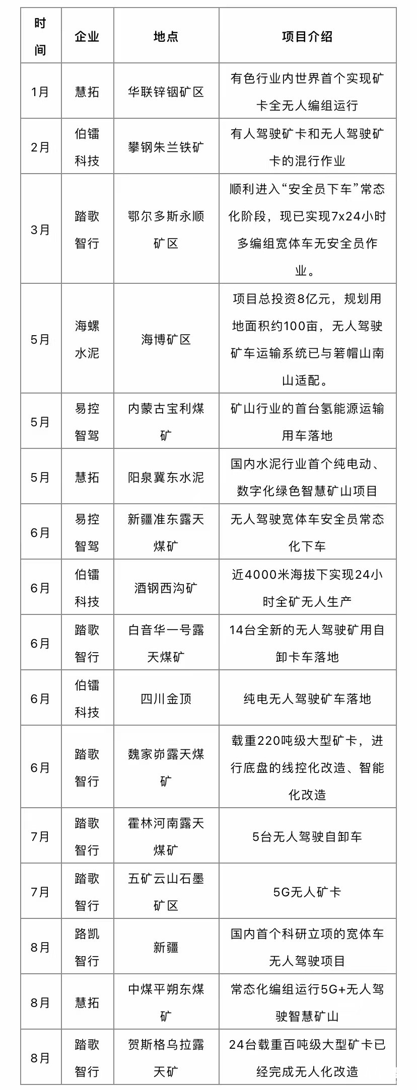 基于技術和產品的快速發展,礦區無人駕駛領域各企業今年以來實現了多個全球、全國“首次”及行業標桿項目,大力推進了國內礦區無人駕駛領域發展,具體包括: