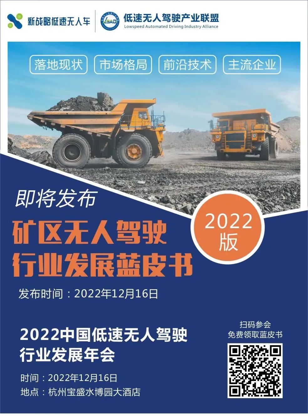 為了解析當前低速無人駕駛在礦區場景的解決方案和市場應用現狀,12月16日,由低速無人駕駛產業聯盟主編,青島慧拓智能機器有限公司、北京易控智駕科技有限公司、上海伯鐳智能科技有限公司、北京路凱智行科技有限公司、北京踏歌智行科技有限公司、名商科技有限公司聯合參編的《礦區無人駕駛行業發展藍皮書(2022版)》將在“2022中國低速無人駕駛行業發展年會”上正式發布,參會人員可免費獲得藍皮書紙質版一份,敬請期待!