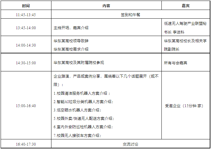 規模及參會對象:限定15-20人,參會人員包括華東某高校領導,巡檢、配送、接駁、清潔環衛領域的低速無人駕駛整車/解決方案供應商(參會人員須是企業副總以上級別)